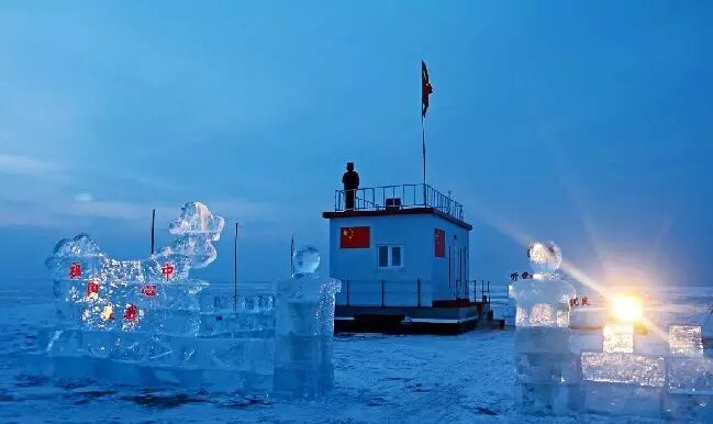 越过“龙口”前行二十分钟,在离岸约九公里处,一座矗立在冰湖上的白色小屋出现在眼前。屋顶飘扬着国旗,一位着迷彩作训大衣的哨兵持枪肃立一侧。小屋正上方,“听党指挥、能打胜仗、作风优良”十二个鲜红大字,在冰雪世界中熠熠闪光,使人感受到强军目标的无远弗届和特殊感召力。界湖执勤官兵有句口头禅:上岸代表军队,下湖代表祖国。走进哨所用晶莹湖冰砌成的院门,凝望冰雪“干打垒”精心组合的中国地图上“祖国在我心中”几个醒目大字,庄严神圣感油然而生。